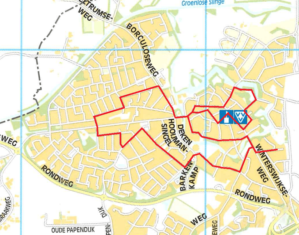 - We steken de Ruurloseweg over en slaan de Mesdagstraat in. Pakken de eerste weg rechts: de Vincent van Goghstraat. Ook hier zien we weer verschillende woonhuizen uit de periode. De oplettende fietser zal de typische stijl ondertussen wel herkennen. We slaan links de Irenestraat in vervolgens rechts de Beatrixstraat. De Oranjebuurt in Groenlo is de eerste grote planmatige stadsuitbreiding van Groenlo. De wijk heeft een tuindorpachtig karakter en is ruim opgezet. De verschillende typen woningen vallen op door de toepassing van hoogwaardige ambachtelijke bouwmaterialen conform de opvattingen van de Delftse School. Aan het eind van de Beatrixstraat gaan we rechtsaf de Ruurloseweg op en nemen vervolgens de rotonde driekwart en gaan de stad weer in.